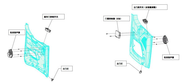 主要配件及圖號分別為:副車門控制開關,圖號:DZ9L149584697 、門窗控制器(DCM),